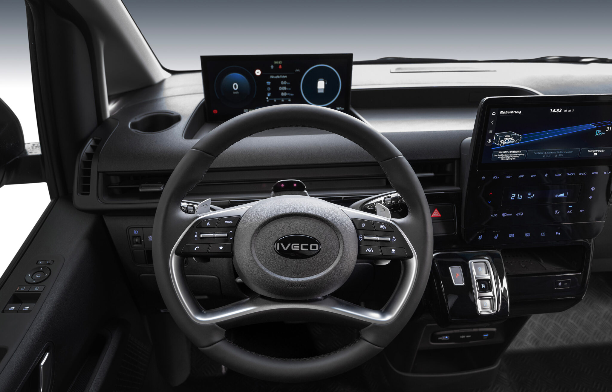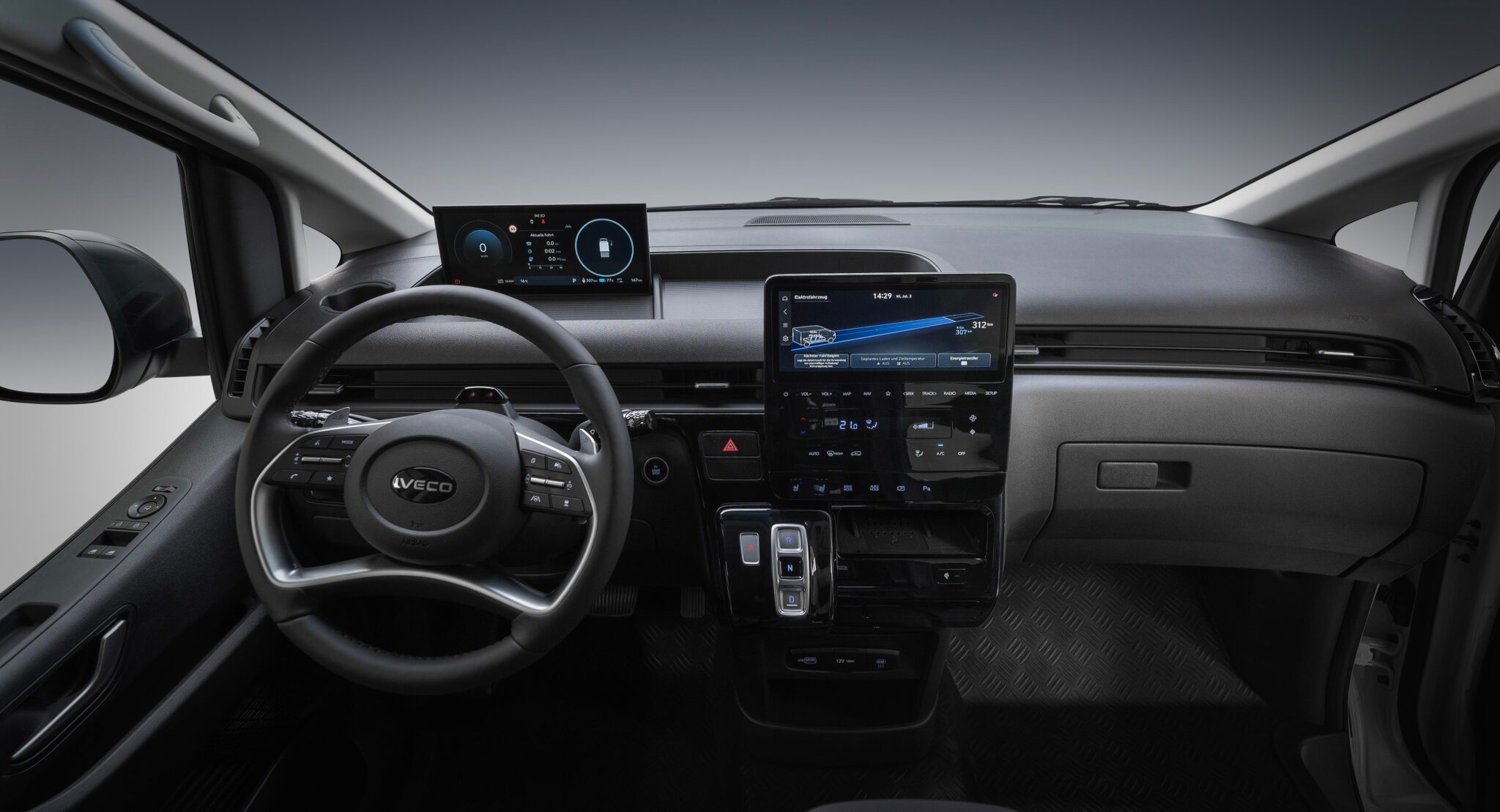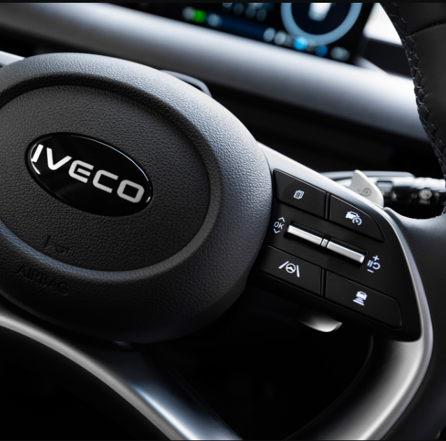 The IVECO eMoovy's cab offers a luxurious and functional work environment, featuring an elegant and well-appointed dashboard.