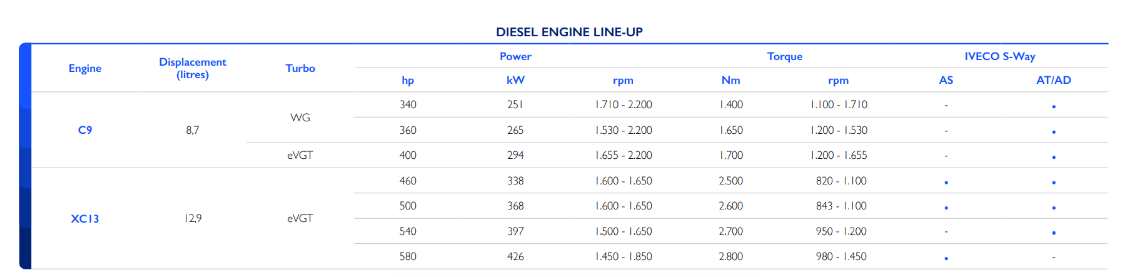 Izbirate lahko med 8,7-litrskim motorjem IVECO C9 NG in novim 12,9-litrskim motorjem XCursor 13. Zaradi odstopanja EU imajo lahko 18- in 26-tonska vozila na zemeljski plin dodatno maso, ki ustreza večji lastni masi. Na voljo so novi rezervoarji za CNG, 2 x 135-litrski in 2 x 175-litrski na vsaki strani, za doseg do 780 km.